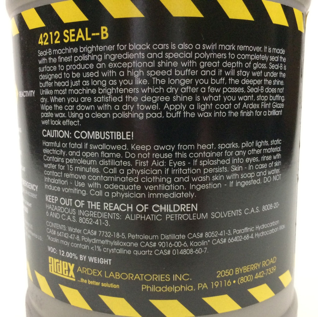 32 oz Consumer size, SEAL-B Is a High-Intensity Machine Brightener. Seal-B is a brightener, and swirl mark remover. It is exceptional on black and other dark colors. Seal-B is grey in color and will not show residue; very important to high volume detailers. Seal-B contains the finest polishing ingredients and special polymers to completely seal the surface and produce an exceptional shine with great depth of gloss. Seal-B is designed to be used with a high-speed buffer, soft polish or final finish pad and will stay wet under pad as long as desired. The longer you buff the deeper the shine. When you are satisfied with the depth of gloss, stop buffing and wipe the car down with a dry microfiber or terry towel. Seal-B contains a mild cleaner and silicone, but no wax. It won’t hold up and protect by itself but it will accept a nice coat of wax.